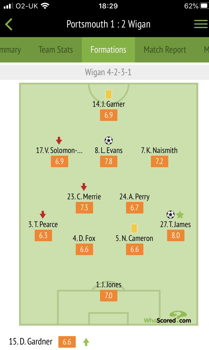 Latics went ahead just before half-time when Lee Evans converted after good work by Viv Solomon-Otabor and Tom James increased their lead on 59 minutes with a super strike from a 30-yard free-kick which flew into the top corner of the Pompey net.