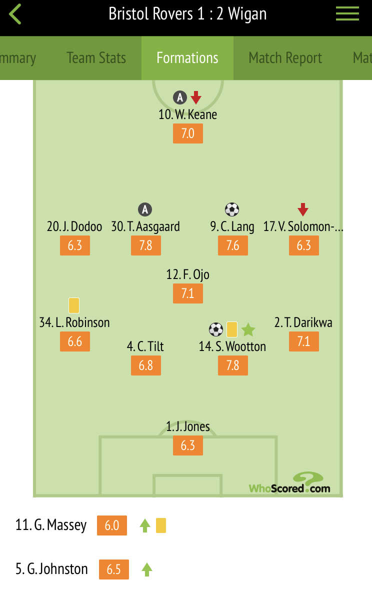 George Johnston and Gavin Massey replaced Keane and Solomon-Otabor on 80 minutes as Latics changed formation to a back three of Johnston, Wootton and Tilt.