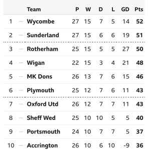 - Latics are now in fourth place on 48 points but with five games in hand on leaders Wycombe who have 52 points. Doncaster remain bottom of the table and are nine points from safety.