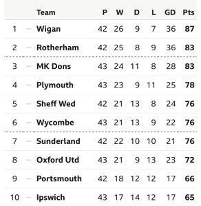 - Despite the setback Latics remain top of the table four points ahead of both second place Rotherham and third place MK Dons. Cambridge move up to 12th in the table.