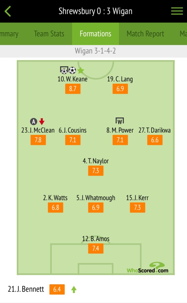 • Latics went ahead just before half-time when Max Power’s free-kick came back off the post and the rebound went in via Shrewsbury midfielder Josh Vela.