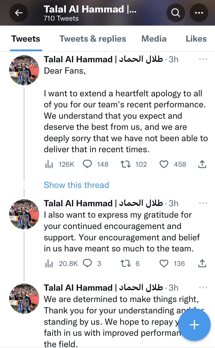 Chairman Talal Al Hammad issued a statement after the game apologising for the form and has promised to take action in the transfer window.