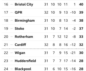 - Latics are now in 22nd place, two points behind Cardiff City with a game in hand. Bristol City are in 16th place in the Championship table.